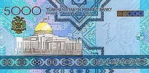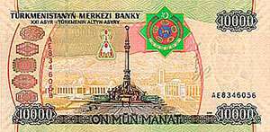 | 10000 manat | 156x78 | Saparmyrat Niýazowyň şekili, Prezident Köşgi |
