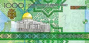 | 1000 manat | 156x78 | Saparmyrat Niýazowyň şekili | Prezident Köşgi | 01.01.2010 |
