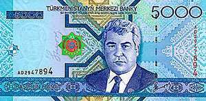 | 5000 manat | 156x78 | Saparmyrat Niýazowyň şekili | Prezident Köşgi | 01.01.2010 |