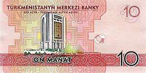 | 10 manat | 132x66 | Magtymguly Pyragynyň şekili | Türkmenistanyň Merkezi bankynyň binasy |