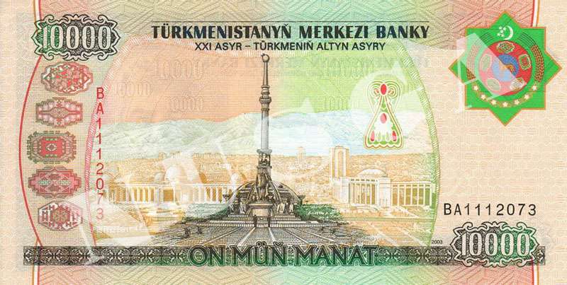 | 10000 manat | 156x78 | 2003 | Saparmyrat Niýazowyň şekili, Prezident Köşgi |